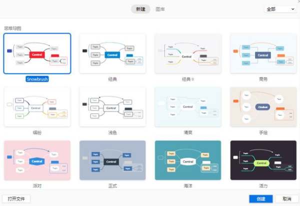 一、打开Xmind软件,任意选择一个模板,自带的模板有一个最大的好处,就是搭配的颜色协调,不至于你做到后面因为颜色,影响了整张图的效果。