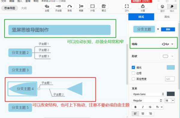 六、填充内容,布局长宽,任意改变单个分枝结构。一般主题的字号在24-30之间,子主题的字号在16-22之间比较合适。