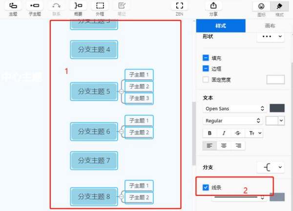 五、再次选中所有的“主题、子主题”,勾选“线条”。