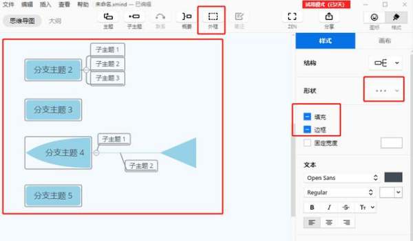 7、外框添加完成,选中需要套外框的(子)主题,点击“外框”即可,颜色、形状可自由选择。所有的内容都填充完之后,在空白处双击,在整张思维导图的右上角加一个自由主题。