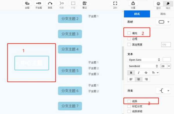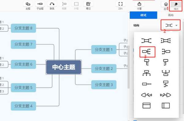 三、选中“中心主题”改变结构,全部主题和子主题都居右。按照以上序号完成相应步骤。