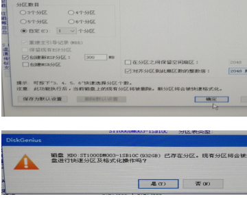 6、创建系统分区打开桌面的【快速分区工具】(或者叫diskgenius),选择【快速分区】,分区表类型选【GUID】(UEFI启动选这个),分区数目可以自己定,勾选【创建新ESP分区】(ESP分区是存放一些系统引导配置的,必须创建且不能删除,大小一般300M够用),不用勾选【创建MSR分区】(保留分区),最后点【确定】>【是】。如果是legacy模式启动,分区表类型选【MBR】,不用创建esp分区,也不用创建msr分区。