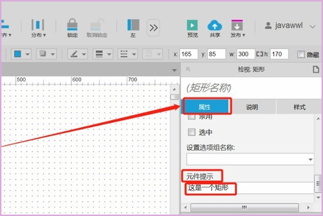 2、然后鼠标点击“矩形”控件后,在右侧“属性”中找到‘元件提示’,在里面输入“这是一个矩形”。