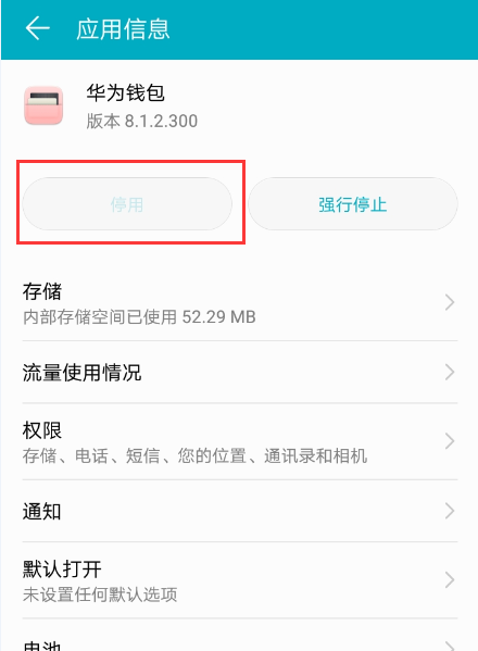 6、返还上一级页面,在页面中找到“华为钱包”,点击进入后可以看到在同样的地方并没有显示“卸载”字样,说明此应用不可从系统中卸载: