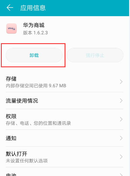 5、点击打开华为商城,可以看到在页面中显示有“卸载”字样,说明此应用可以卸载,点击卸载即可成功将华为商城卸载: