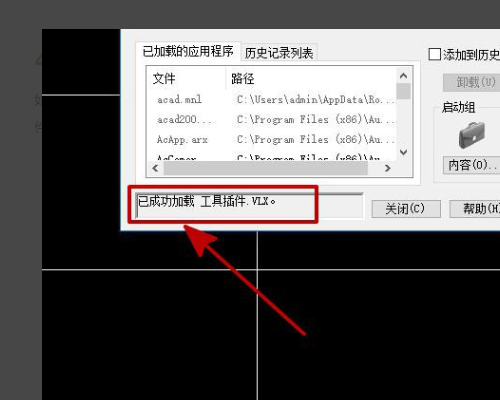 4、如果在对话框下面显示"已加载成功 工具插件.VLX",则说明加载成功,如图所示。