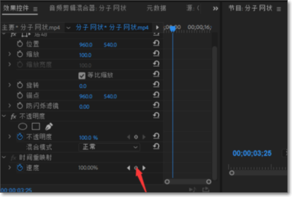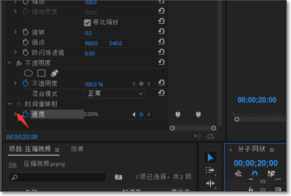 5、然后点击【时间重映射】速度前面的码表,设置第一个关键帧,