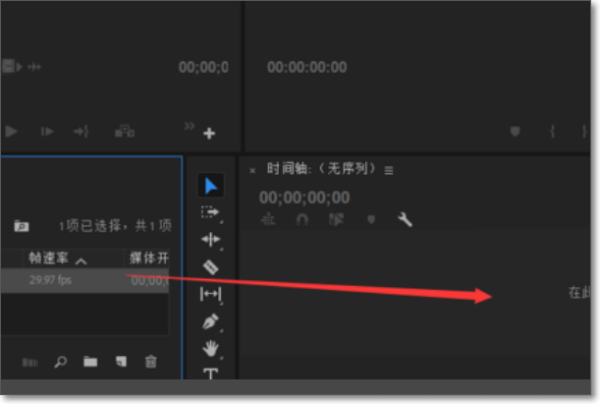 3、选中导入的视频素材,按住鼠标左键不松将其拖到时间轴窗口位置上单击鼠标,来创建序列,视频素材位于自动生成的序列的视频轨道1上。