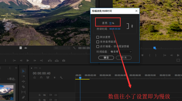 6、同样的,如果要慢放视频,只需要将速度的数值改为小于100%。当速度数值小于100%并确定设置后视频就会出现慢放效果。