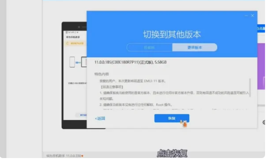 步骤7:在电脑端依次点击“恢复”、“版本回退”。请确保已备份好数据后(QQ、微信等第三方应用需单独备份),在弹出的“当前使用的是HarmonyOS,回退会导致HarmonyOS特有应用丢失。确定回退至安卓系统?”对话框中点击“回退”。