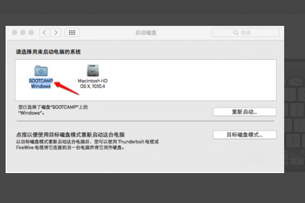 4,然后我们选择“Boot Camp Windows”选项,点击”重新启动“选系那个,就设置为启动后默认进入的系统了。