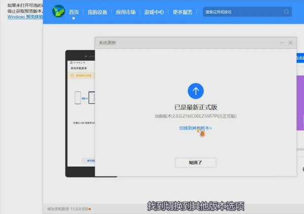 6. 在回退前,请先手动将电脑端华为手机助手升级到最新版本。