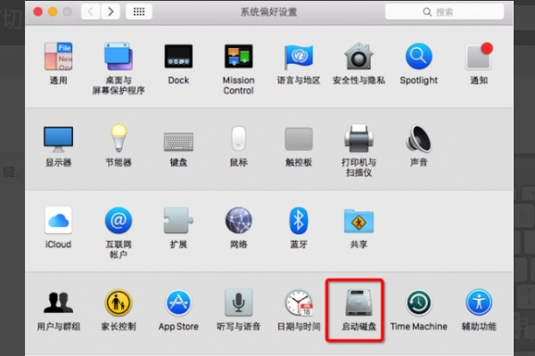 3、然后我们在”系统偏好设置“选项里找到并点击”启动磁盘“选项。