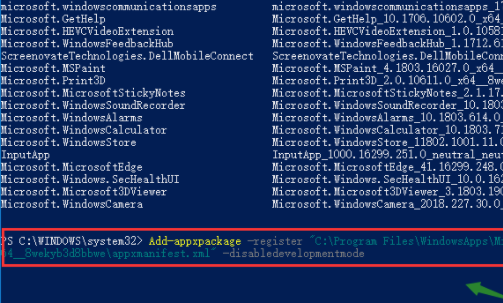 5、然后进入新的界面,在界面中输入以下的命令,Add-appxpackage -register "C:\Program Files\WindowsApps\Microsoft.WindowsStore_11802.1001.11.0_x64__8wekyb3d8bbwe\appxmanifest.xml" -disabledevelopmentmode,回车即可安装。