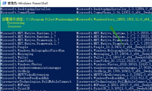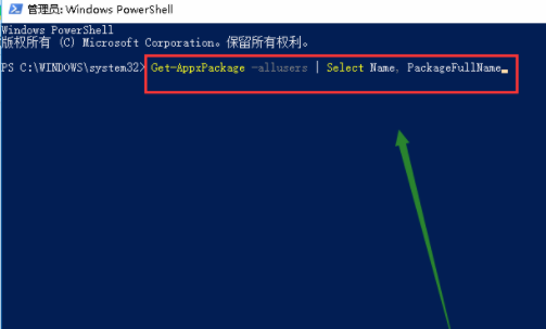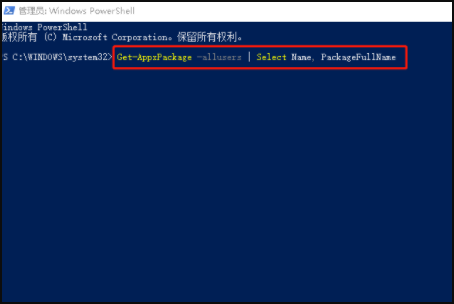 3、进入输入powershell应用窗口,命令Get-AppxPackage -allusers | Select Name,PackageFullName后回车。