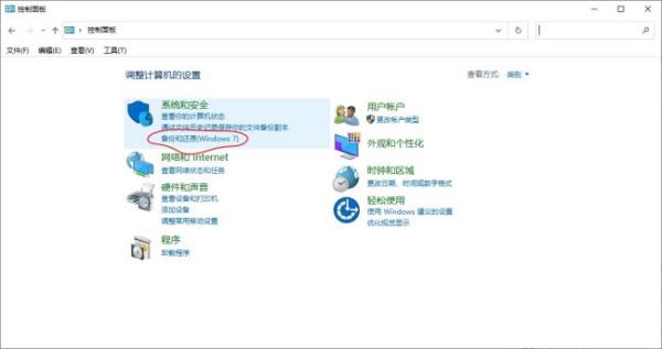 2.如上图在弹出页面中单击选项“备份与还原”(有的版本可能需要单击“系统与安全”后进行选择)
