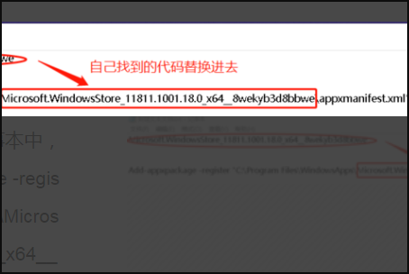 6、点击复制替换后的代码“Add-appxpackage -register "C:\Program Files\WindowsApps\Microsoft.WindowsStore_11811.1001.18.0_x64__8wekyb3d8bbwe\appxmanifest.xml"-disabledevelopmentmode”粘贴至Windows Powershell组件页面中,点击键盘回车。