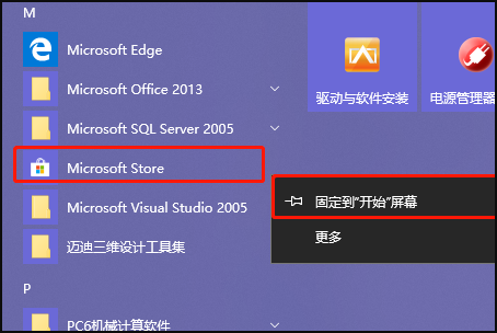 7、点击开始程序,即可从程序中找到Microsoft store,鼠标右键点击“固定到开始屏幕”就完成了。