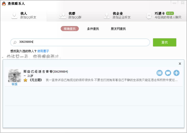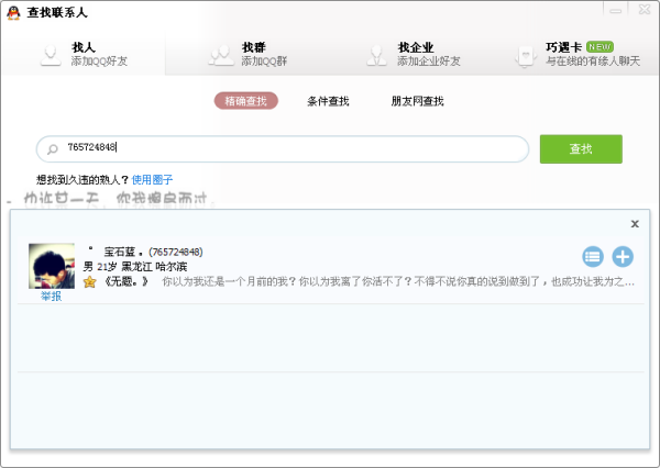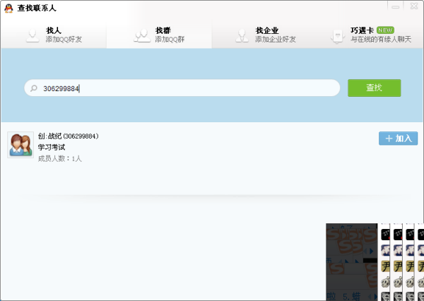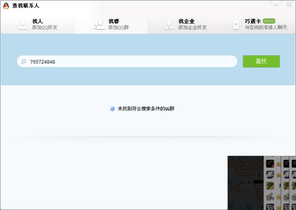 QQ群就是这样,你选择找群用你自己的QQ号码可能就会找出一个群来,当然只是可能啊,我给你个例子吧。