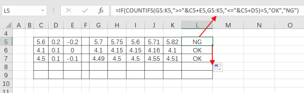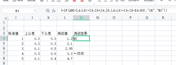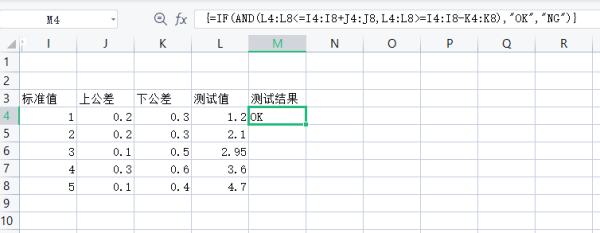 公式:=IF(AND(L4:L8<=I4:I8+J4:J8,L4:L8>=I4:I8-K4:K8),"OK","NG")三键结束(同时按Ctrl+shift+enter)
