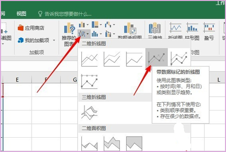 4、依次点击“插入”>“二位折线图”>“带数据标记的折线图”;