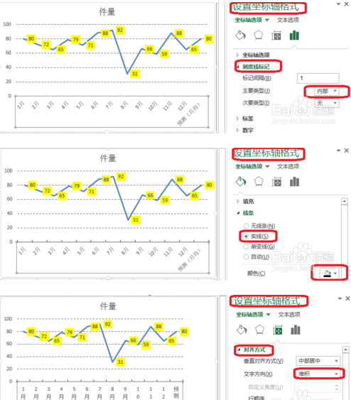 设置坐标轴格式——对齐方式——文字方向——堆积。