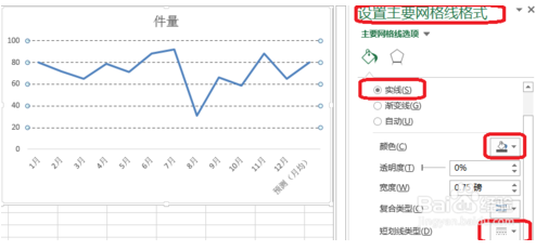 设置主要网格线格式——线条(实线)——颜色(黑色,淡色35%)——短划线类型(短划线)