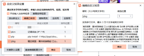 别的输入法我不知道有没有这种设置,我用的搜狗输入法就有自定义短语设置,只要设置了,我打jzbg就能直接输出精忠报国的歌词出来