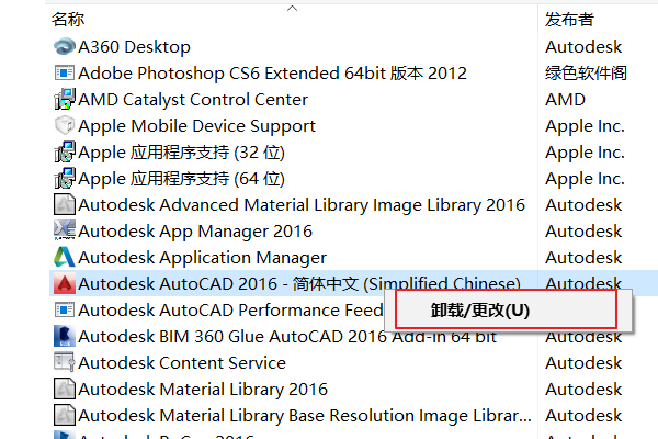 4、在列表中得到CAD软件,点击鼠标右键,继续点击卸载更改。