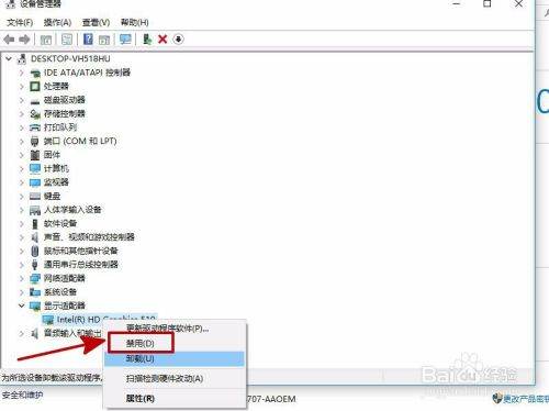 右键点击“显示适配器”,选择“禁用”,如图所示。