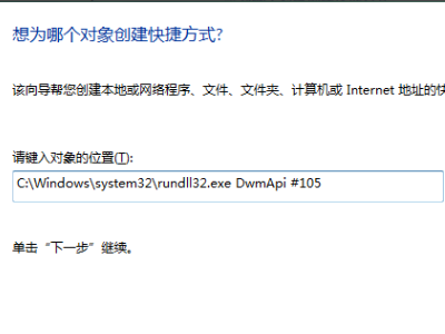 2、我们在复制输入【C:\Windows\system32\rundll32.exe DwmApi #105】点击【下一步】。