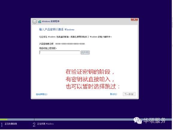 准备就绪后会重启,又到了验证产品秘钥的阶段,有秘钥可以直接输入,也可以暂时选择以后再说