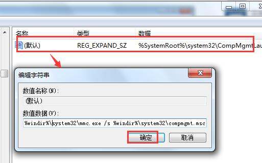 3、在右侧窗口中可看到一个默认的子键。双击打开它,将数值数据修改为%windir%\system32\mmc.exe /s %windir%\system32\compmgmt.msc,点击确定即可。