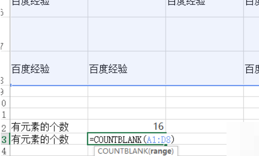 5、然后使用相同的方法输入=COUNTEBLANK(A1:D8),A1表示列A,第一行,D8表示列D和行8。
