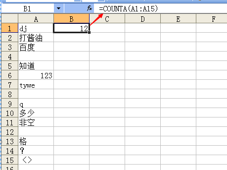1、在B1单元格输入“=counta(A1:A15)”即可。