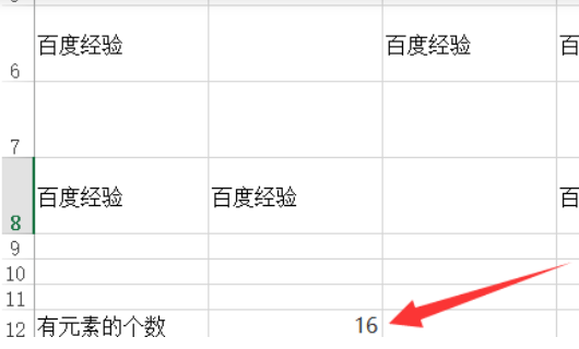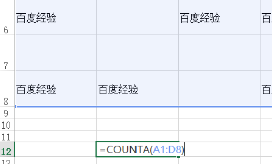3、然后在任何空白处写=COUNTA(A1:D8),A1表示列A,第一行,D8表示列D,第8行。