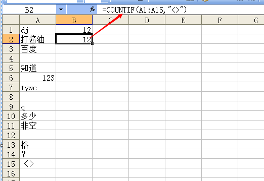2、在B2单元格输入“=COUNTIF(A1:A15,"<>")”亦可。
