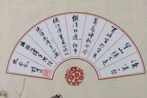 扇面的内容比较自由,可以是诗词,名句,对联,也可以是一段话。书体一般是行书、草书。根据书写的内容篇幅,两线之间可以单行、也可以双行、多行。总之,每一行行气的重心线要指向原点,从而使通篇呈扇形分布。