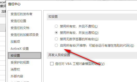 3.点击宏安全,可以信任中心的宏设置,然后启用所有选中的宏勾选。