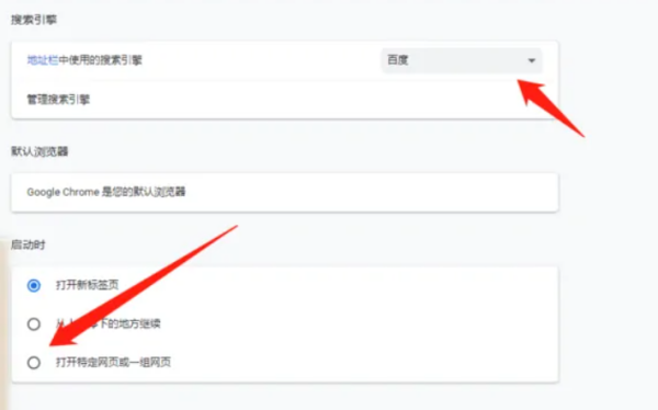 3、将默认的Google改称百度或者其他的搜索引擎,可以看到已经改好了,但是还有一步不能少,选中下面的启动时中的打开特定网页。