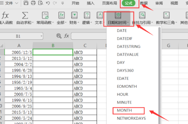 5、还可以点击菜单栏的“公式”,之后点击“日期与时间”,在下拉框中找到MONTH,并点击;