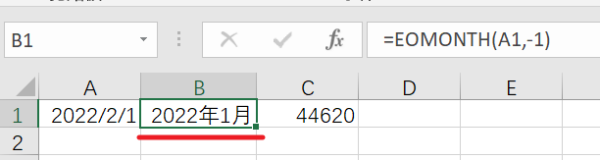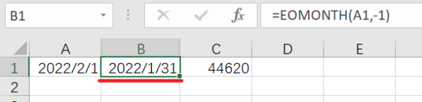 B1单元格输入公式=eomonth(A1,-1),返回结果为数值44592