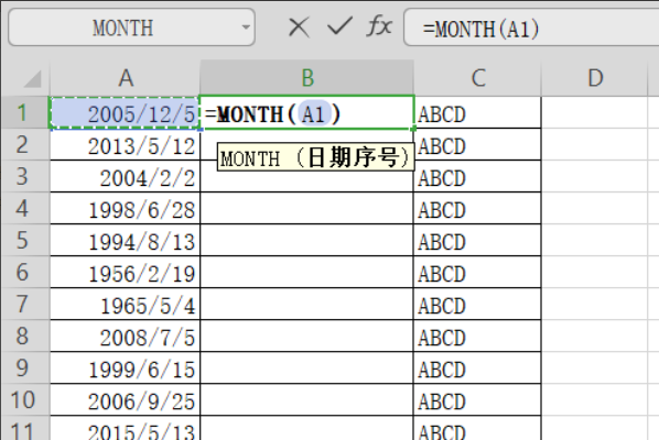4、在空白格的第一列输入“=MONTH()”,光标会自动跳进括号中,可以点击左边的日期,括号中会出现日期所在的表格号;