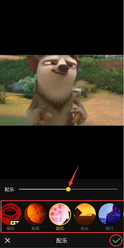 2、点击之后就可以进入配乐的页面,用户可以去除视频的原音,然后可以下载你喜欢的音乐文件,点击添加即可: