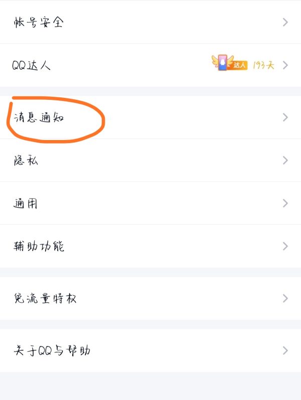 3、进入“QQ”选项的页面后,点击此页面上的“通知”选项。