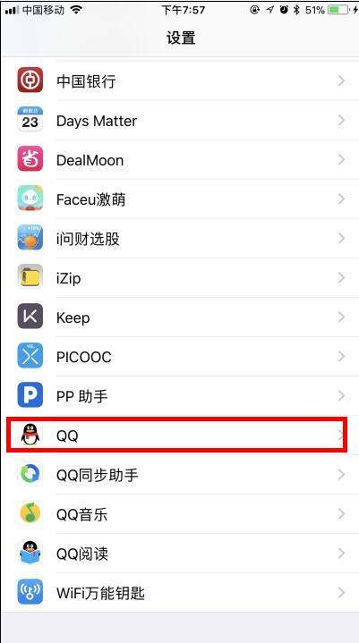 2、在“设置”应用软件的页面中“QQ”选项,然后点击。