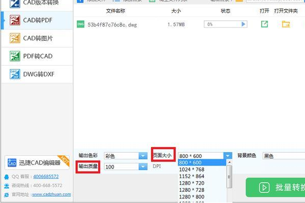 5、最后就可以在界面下方找到“页面大小”后的倒三角图形进行点击了,点击后根据需要选择页面大小,接着依旧点击输出质量后的倒三角图形,在下拉框中进行输出质量的选择,选择完成后点击下方批量转换按钮就可以了,就不会再出现CAD转PDF图形显示不全的情况了。