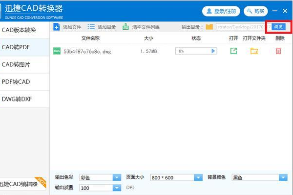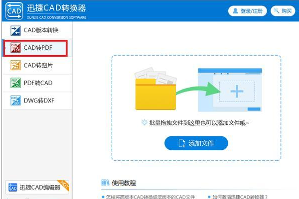 2、然后就能打开迅捷CAD转换器这款软件了,打开之后会在左侧看到五个功能选项,这里需要点击第二个“CAD转PDF”这个功能。
