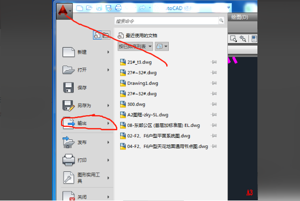 1、首先,打开cad图纸的副本,单击左上角的图标,将弹出一个下拉框,单击输出按钮,如下图所示,然后进入下一步。