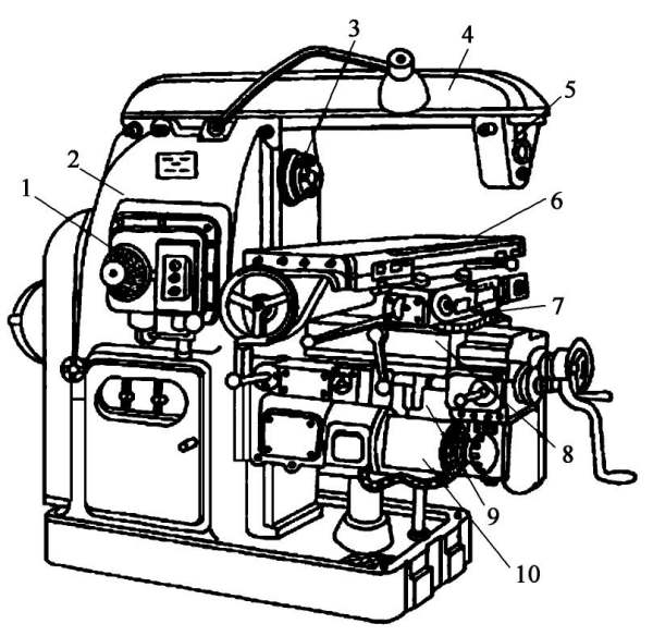 图5-30 卧式万能升降台铣床1—主轴变速机构;2—床身;3—主轴;4—横梁;5—刀杆支承;6—工作台;7—回转盘;8—横滑板;9—升降台;10—进给变速机构工作台铣床的种类很多,根据它的结构形式和用途可分为:卧式升降台铣床(简称卧式铣床)、立式升降台铣床(简称立式铣床)、数控铣床、工具铣床和龙门铣床等。其中卧式万能升降台铣床是目前应用最广泛的一种铣床,如图5-30所示。其主要特征是主轴轴线与工作台面平行,主要由床身、主轴、横梁、纵向工作台、转台、横向工作台、升降台等部分组成。